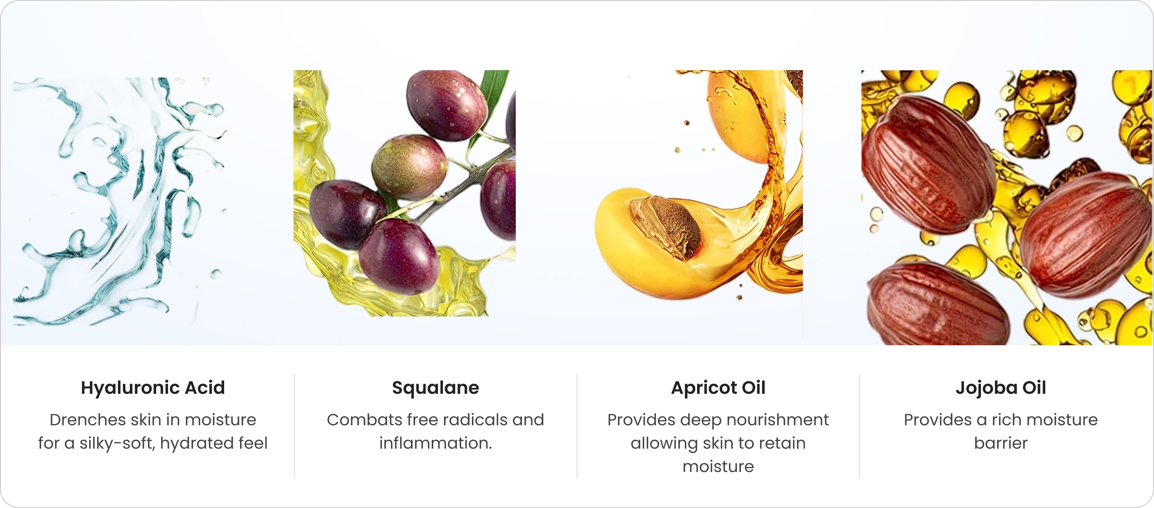 Water (Aqua), Simmondsia Chinensis (Jojoba) Seed Oil, Polyacrylamide, C13-14 Isoparaffin, Squalane, Laureth-7, Sodium Hyaluronate, Prunus Armeniaca (Apricot) Kernel Oil, Phenoxyethanol, Ethylhexylglycerin