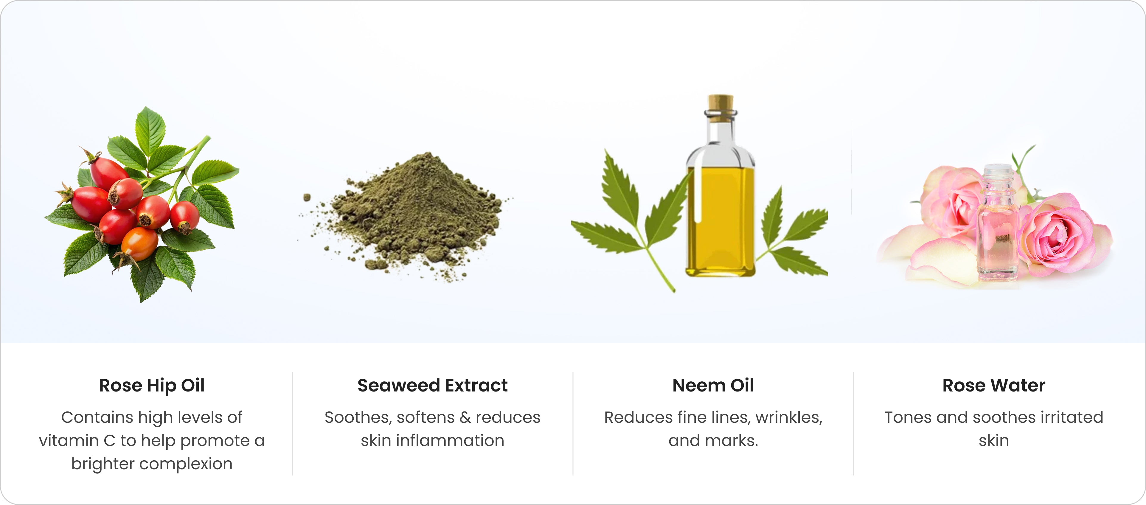 Water (Aqua), Glycerin, Sodium C14-16 Olefin Sulfonate, Cocamidopropyl Betaine, Cocamide MIPA, Rosa Damascena Flower Water, Propanediol, Natural Fragrance, Sodium Chloride, Chondrus Crispus Extract, Citric Acid, Ethylhexylglycerin, Potassium Sorbate, Melia Azadirachta Flower Extract, Melia Azadirachta Leaf Extract, Corallina Officinalis Extract, Betaine, Coccinia Indica Fruit Extract, Rosa Rubiginosa Seed Oil, Decyl Glucoside, Krameria Triandra Root Extract, Lycopene.